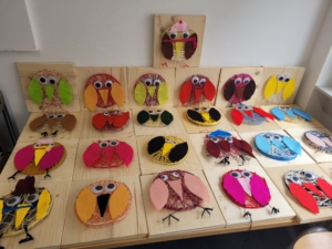 Das erste Projekt am Montag war zunächst ein Waldtier, eine Eule. Mit Nägeln (es war sehr, sehr laut im Raum!) wurde der Umriss festgelegt, um dann diesen mit Fäden, Filz und Wackelaugen Struktur zu geben. Der Fantasie waren keine Grenzen gesetzt, sodass einige der bunten Erzeugnisse auch noch Schals und Mützen erhielten.