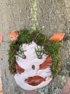 Am Dienstag, zum Glück der schönste Tag der Woche, fuhren wir dann zum oben erwähnten Wald, um dort Stöcke für das Donnerstagsprojekt zu sammeln sowie allerlei kleine Dinge für die Waldgesichter, die jedes Kind an einem Baum selbst gestalten konnte. Eicheln, Blätter, Stöckchen, Moos, alles kam zur Verwendung. Aus dem mitgebrachten Klumpen Naturton, den jedes Kind dabeihatte, entstanden die schönsten Gesichter. Jede/r wurde mit ihrer/seiner Maske noch fotografiert. Die Bilder wurden nachmittags ausgedruckt und in selbst gestalteten Rahmen mit nach Hause genommen. Was wohl die späteren Spaziergänger beim Anblick der Masken gedacht haben mögen?