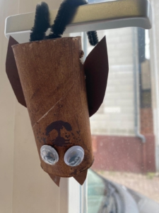 Für den Mittwoch stand ein Tier auf dem Programm, das man in Höhlen findet, nicht nur im Wald, aber auch da. Die Fledermaus. Sie passt ja gleichzeitig auch zum nahen Halloween. Aus Klorollen, Pappe, Pfeifenreinigern und den unverzichtbaren Wackelaugen kamen die lustigsten (oder nach Wunsch auch gruseligsten) Flattermänner zustande.
