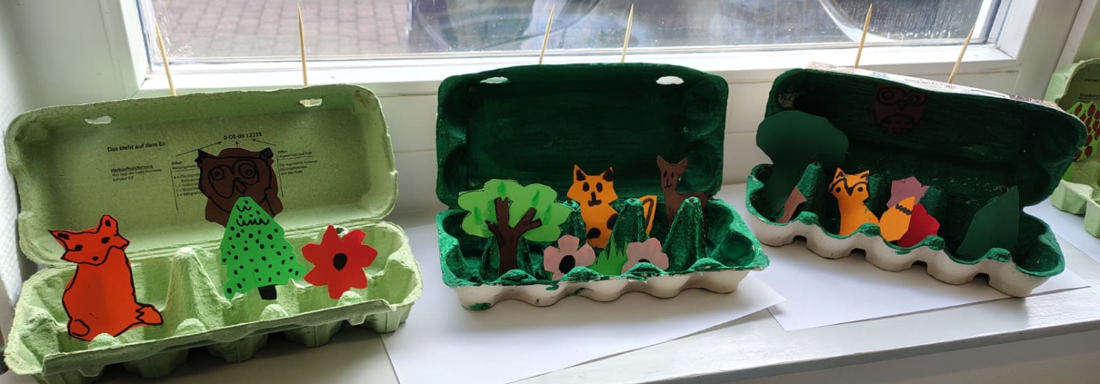 Zum Abschluss am Freitag, ja, da muss es dann ein kompletter Wald sein. Aus Eierkartons, Farbe und Pappe entstand eine kleine Waldlandschaft mit Fuchs und Reh, sicher ein schönes Andenken an diese Woche, die sehr harmonisch verlaufen ist.