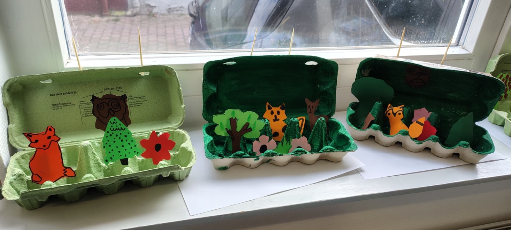 Zum Abschluss am Freitag, ja, da muss es dann ein kompletter Wald sein. Aus Eierkartons, Farbe und Pappe entstand eine kleine Waldlandschaft mit Fuchs und Reh, sicher ein schönes Andenken an diese Woche, die sehr harmonisch verlaufen ist.