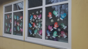 Es wurde gebastelt, um die Fenster vor dem Betreuungstrakt schmücken zu können, diesmal Fausthandschuhe mit den Abdrücken der Kinder und Sterne aus Muffinförmchen. Jedes Betreuungskind hatte mindestens ein Teil für das Fenster beigetragen (mehr oder minder freiwillig, aber es sollte ja wirklich von jedem Kind etwas dabei sein).
