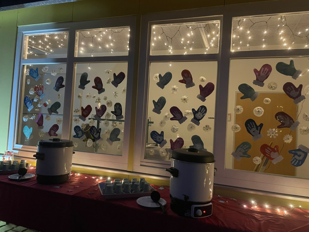 Es wurde gebastelt, um die Fenster vor dem Betreuungstrakt schmücken zu können, diesmal Fausthandschuhe mit den Abdrücken der Kinder und Sterne aus Muffinförmchen. Jedes Betreuungskind hatte mindestens ein Teil für das Fenster beigetragen (mehr oder minder freiwillig, aber es sollte ja wirklich von jedem Kind etwas dabei sein).